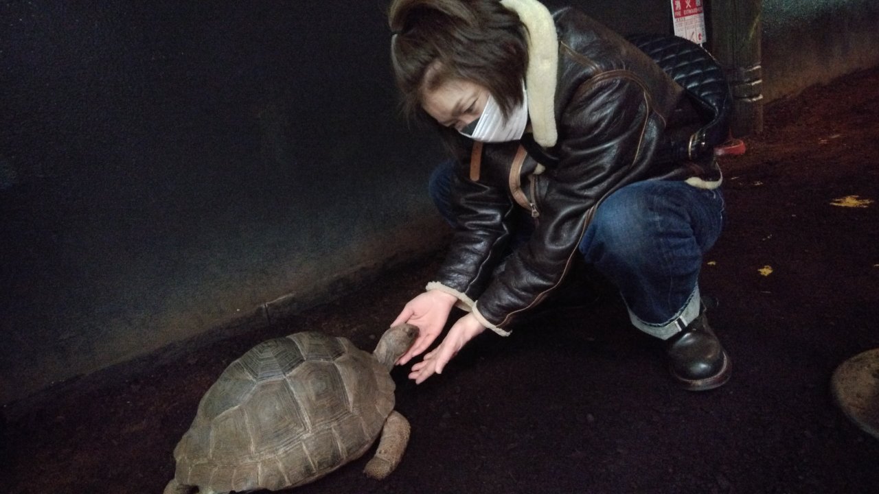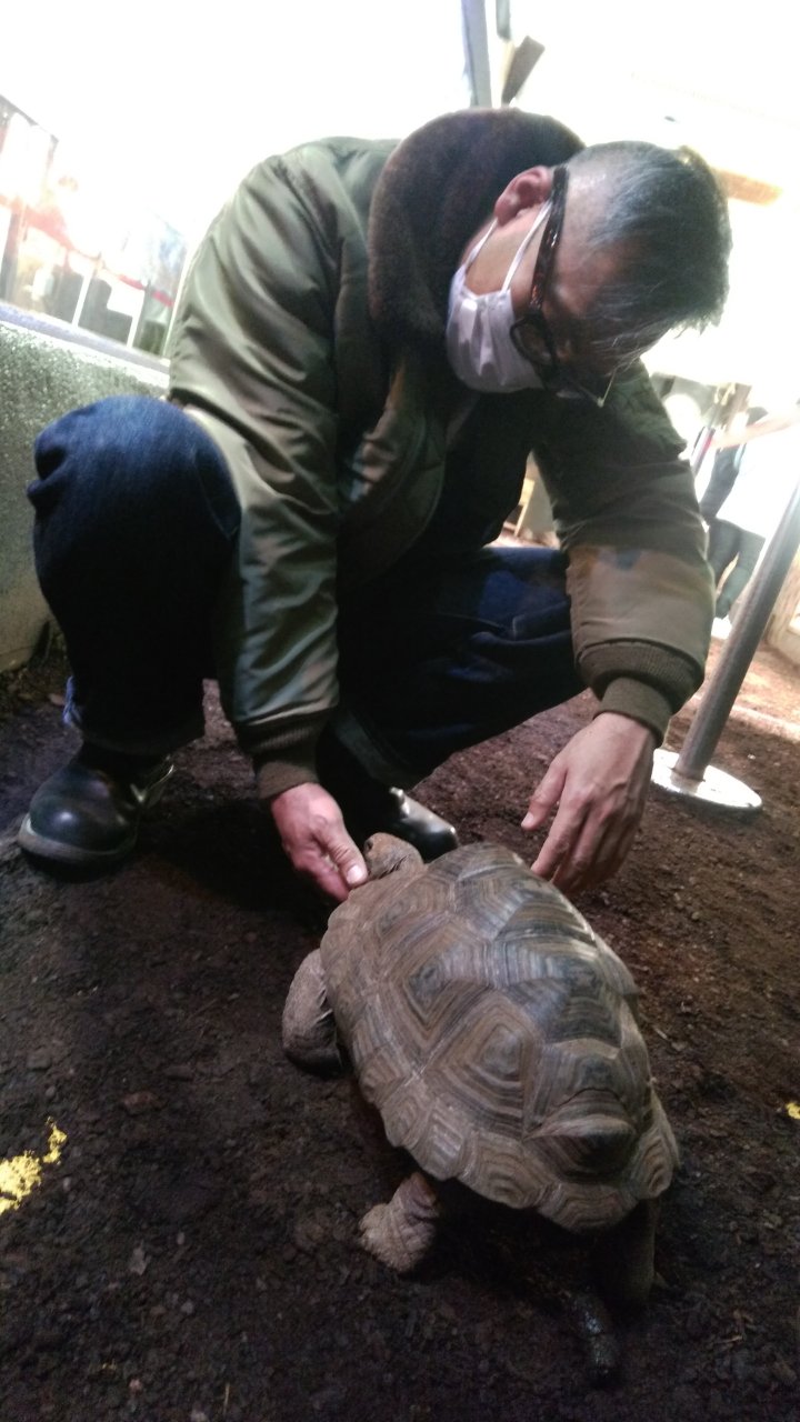 亀のアタマをなでなでして嬉しそうなムータン。