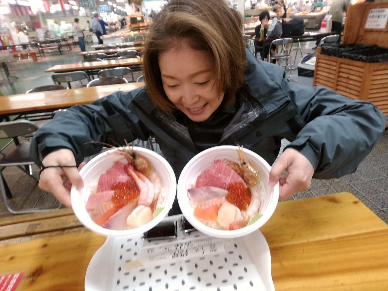 釧路・和商市場で勝手丼。あ、初日からカッパ着てます。いつもの事。